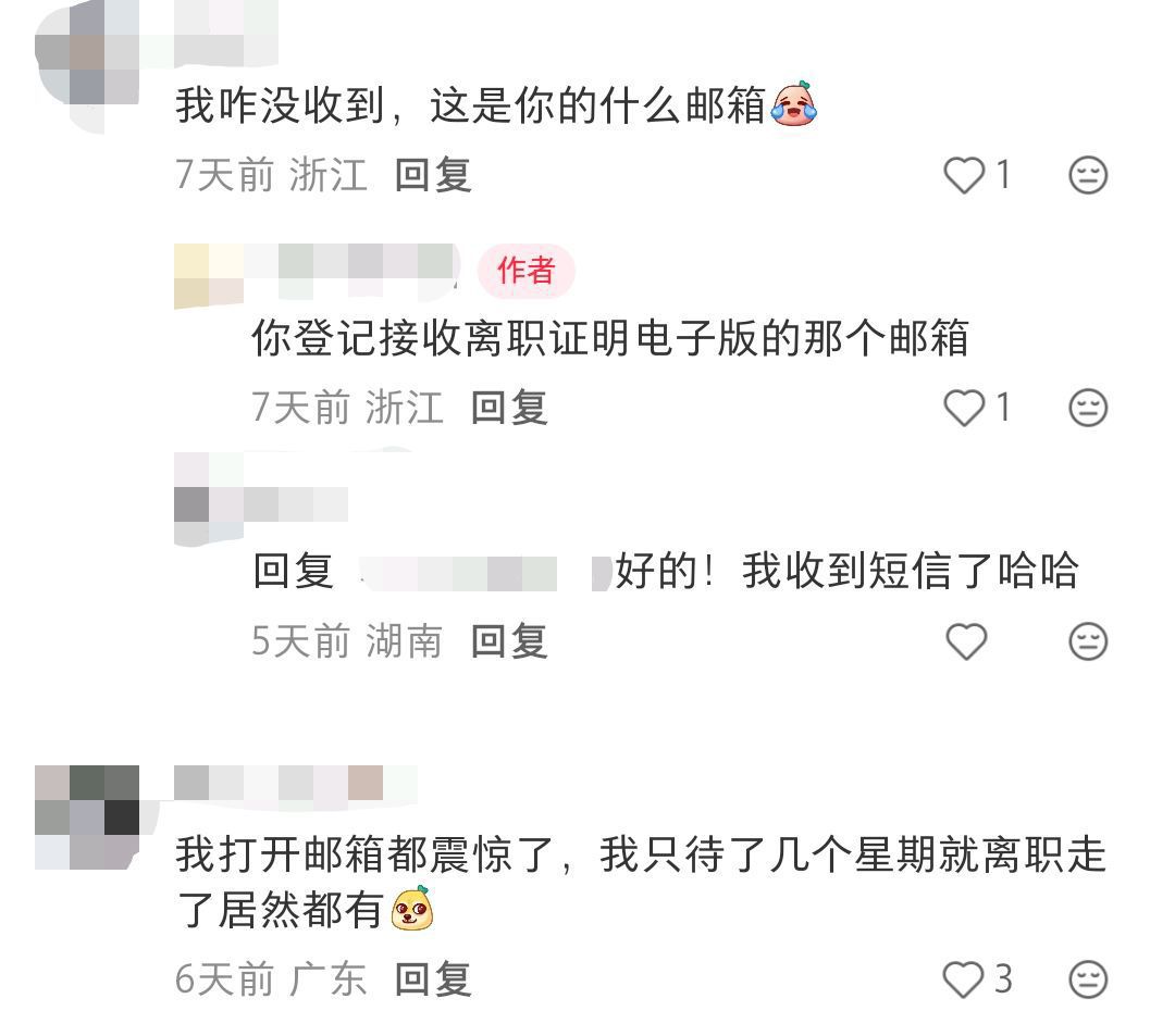 上述发布后引发不少网友热议,有其他大疆前员工在评论区留言询问:“我咋没收到,这是你的什么邮箱?”博主回复称:“是你登记接收离职证明电子版的那个邮箱。”两天后,这名网友回到评论区说:“我收到了短信哈哈。”