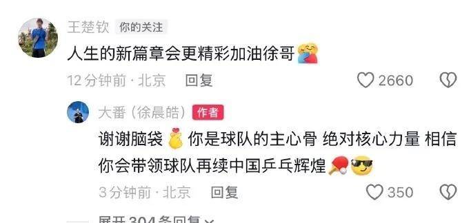 2026年1月31日,徐晨皓在手机镜头前搓了搓脸,说要跟待了15年的国家队说再见了。 这哥们儿外号大番,3岁就摸球拍,17岁进国家队,可翻遍他的荣誉簿,世青赛男双冠军、乒超团体金牌,愣是找不着一块单打世界冠军奖牌。 就这么个无冕之王,离队视频一发,王楚钦、许昕、梁靖崑全跑来留言,评论区直接炸成泪海。