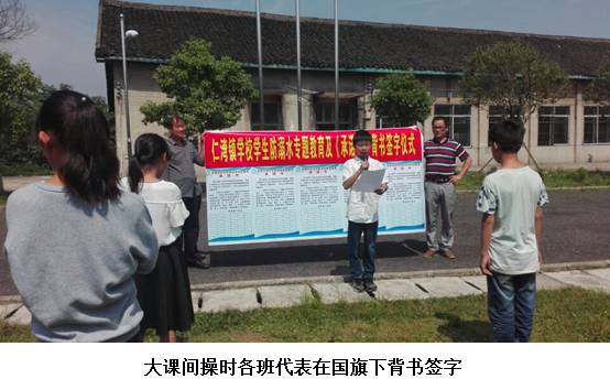 近日,该校除了按教育局开展防溺水“六个一”规定动作外(挂一张图、唱一首歌、发一封信、看一次专题片、上一次课、写一篇观后感),特增加一个“狠”动作:要求每个学生对《仁湾镇学校学生防溺水“六不”承诺书》到班主任处背书签字。活动过程是:在大课间操上,全校举行背书签字仪式,各班代表在国旗下背书签字;在读报课上,学校给每个班级教室黑板左边贴上一张永久性的《学生防溺水“六不”承诺书》,学生先集体背书,再人人到班主任处过关背书,最后个个在《承诺书》上用记号笔签上自己的名字。这一活动给学生思想上很大的震憾,极大的提高了学生防溺水安全意识。(蒋剑中)