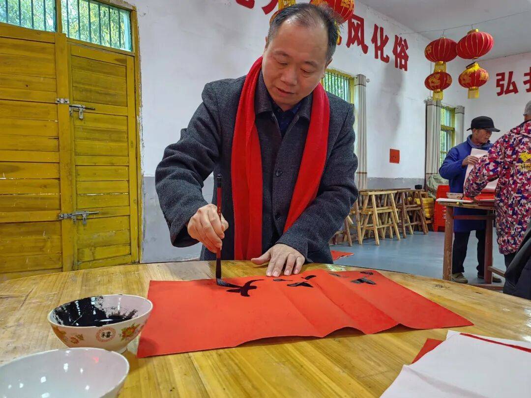 村民们围站在桌旁,挑选心仪的春联内容,静候师生们完成创作。志愿者们热情服务,主动协助铺开红纸、晾晒春联,引导村民有序排队领取。“这手写的春联不仅有文化味,还带着学院的祝福,感觉日子都要更红火几分!”领到春联的村民喜悦不已。