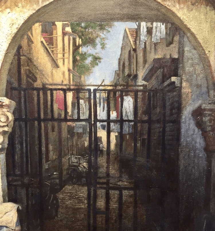 石库门,是老上海的城市名片,是中西文化交融的独特印记,青砖黛瓦、拱形门楣、雕花栏杆,既有江南民居的温婉,又有西方建筑的雅致,里弄纵横交错,屋檐错落相连,藏着老上海人最质朴的日常与温情。清晨的早点香气、午后的闲谈笑语、傍晚的灯火阑珊,邻里间的寒暄相助、孩童们的追逐嬉戏,每一个瞬间都饱含烟火气息,每一处景致都承载着城市记忆,这份独有的老城韵味,成为吕文扬大师不竭的创作灵感。