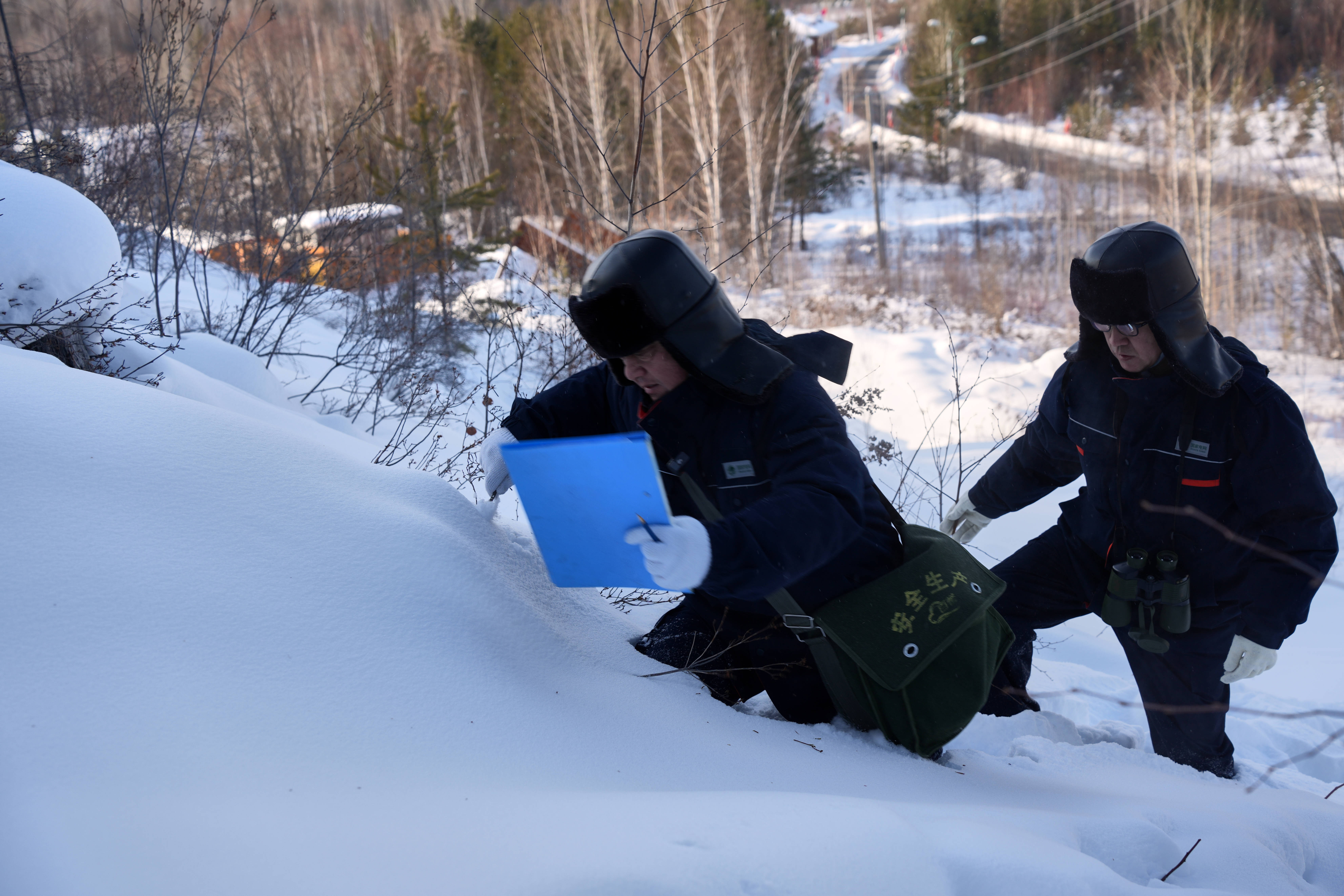 北极供电所负责北极村附近的7条供电线路,大多架设在山上的白桦林中。山虽然不算高,但走在齐腰深的积雪中,即便是经验丰富的吕建生,在和同事互相搀扶前行中,也难免滑倒,“不怎么疼,别让雪灌进衣服里就行。”吕建生从雪里熟练地爬起后,拍拍身上的积雪,向更深处走去。