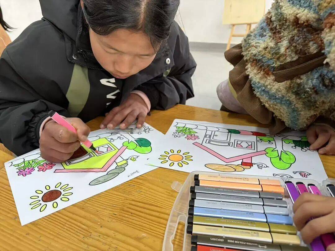课后特色兴趣课程同样精彩。以美术创作为核心,志愿者为孩子准备水彩笔等材料,鼓励他们自由描绘心中家园,手把手指导握笔姿势与色彩搭配。孩子们完成作品后开心合影,斑斓画作与灿烂笑容,成为寒假里的动人风景。